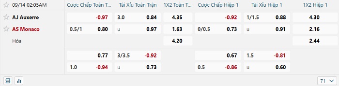 - Kèo tỷ số H1 Auxerre vs Monaco: 0-1