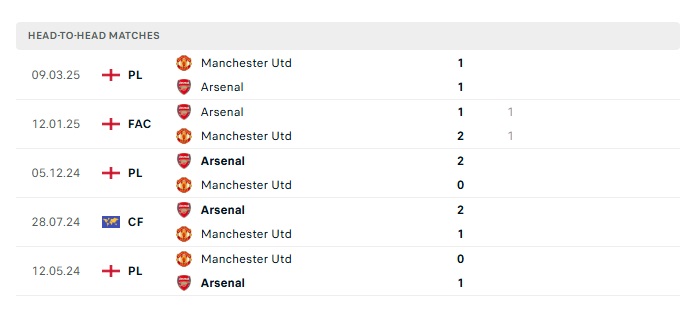 Phong độ gần đây Man Utd vs Arsenal