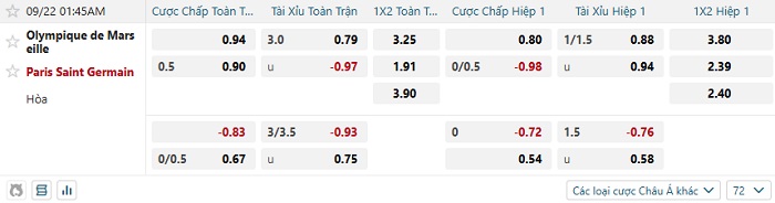 - Kèo tỷ số H1 Marseille vs PSG: 0-1