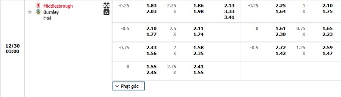 Bảng tỷ lệ kèo bóng đá Middlesbrough vs Burnley