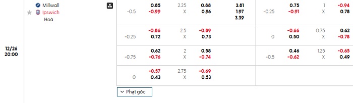 Hiện tại, đội khách Ipswich đang có nhận mức chấp châu Á -1/2 từ nhà cái và họ có đủ sự tự tin để thắng kèo. Trong 4 trận sân nhà gần nhất của Millwall, họ chỉ có 1 thắng kèo, còn lại toàn thua. Ngoài ra thì trong 3 lần đụng độ nhau gần nhất của hai đội, IPswich cũng đã toàn thua cả 3. Do đó, các chuyên gia đều tin rằng trận đấu hôm nay sẽ có Ipswich là lựa chọn an toàn nhất.