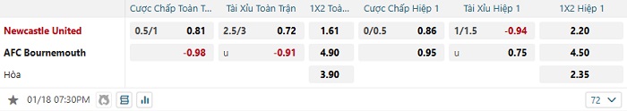 Bảng tỷ lệ kèo bóng đá Newcastle vs Bournemouth