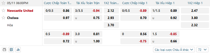 Soi kèo châu Á, kèo Newcastle vs Chelsea