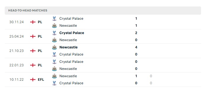 Lịch sử đối đầu Newcastle vs Crystal Palace