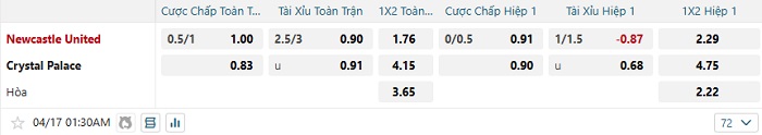 Bảng tỷ lệ kèo bóng đá Newcastle vs Crystal Palace