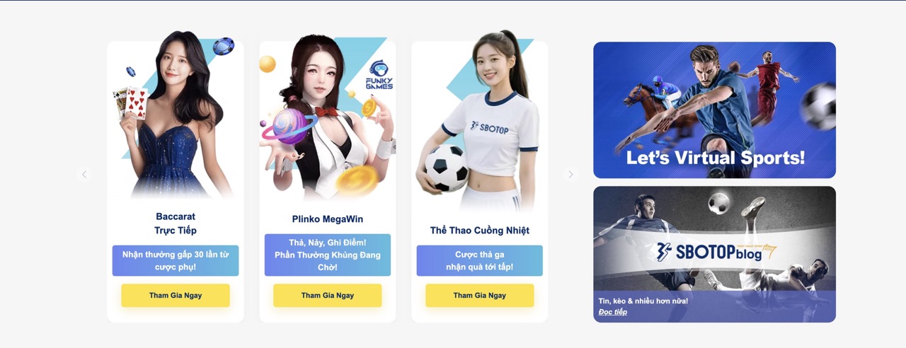 Bằng việc hội tụ những tựa game đình đám của bóng đá, bóng rổ, đua xe… đến từ những giải đấu hấp dẫn hàng đầu, nhà cái SBOTOP cho phép người chơi của mình những kèo cược hấp dẫn như cược, xâu, xiên, chấp …… Vì vậy đây vẫn là sảnh game giúp nhà cái này liên tiếp thu hút người chơi mới nhờ vào lợi nhuận khủng mà sảnh game Thể Thao Ảo mang lại.