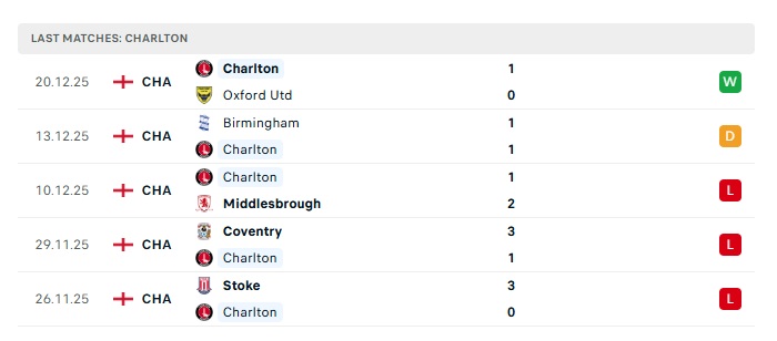 - Phong độ gần đây Charlton Athletic