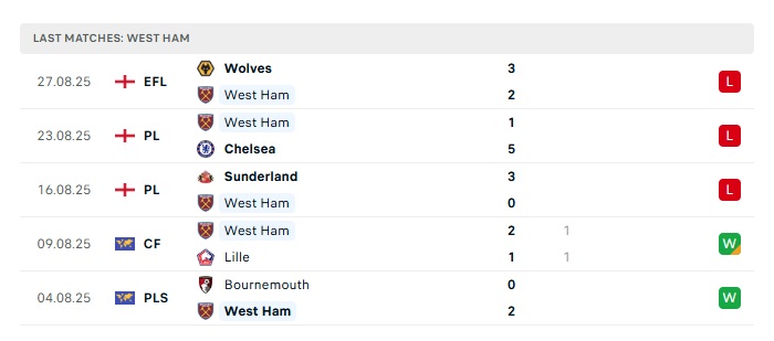 • Phong độ gần đây West Ham Utd