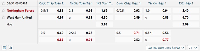Bảng tỷ lệ kèo bóng đá Nottingham Forest vs West Ham Utd