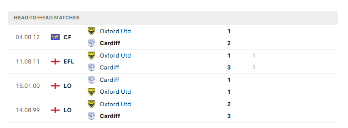 Lịch sử đối đầu Oxford Utd vs Cardiff