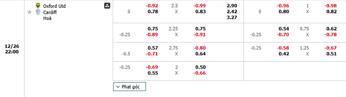 Bảng tỷ lệ kèo bóng đá Oxford Utd vs Cardiff