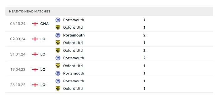 Lịch sử đối đầu Oxford Utd vs Portsmouth