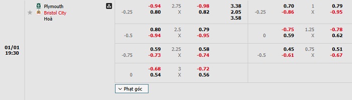 Bảng tỷ lệ kèo bóng đá Plymouth Argyle vs Bristol City