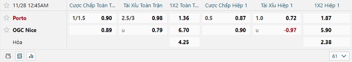 - Kèo tỷ số H1 Porto vs Nice: 1-0