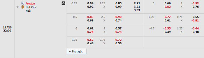 Bảng tỷ lệ kèo bóng đá Preston vs Hull City