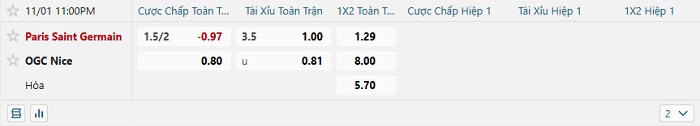• Kèo tỷ số H1 PSG vs Nice: 1-0