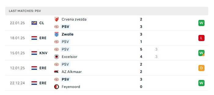 • Phong độ gần đây PSV Eindhoven