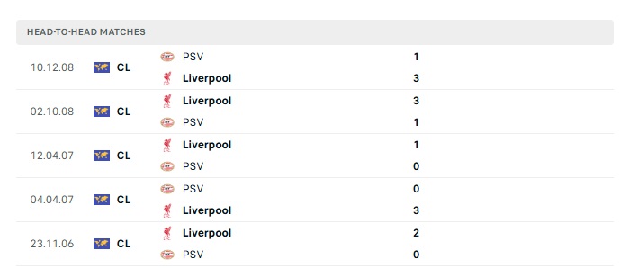 Lịch sử đối đầu PSV Eindhoven vs Liverpool