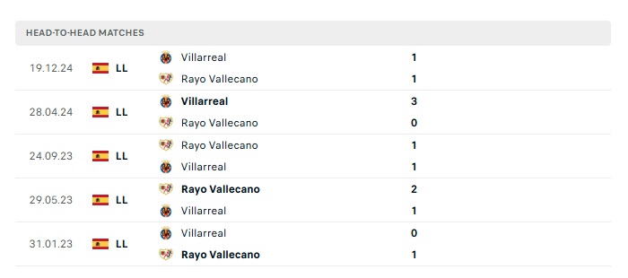Lịch sử đối đầu Rayo Vallecano vs Villarreal