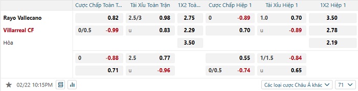 Bảng tỷ lệ kèo bóng đá Rayo Vallecano vs Villarreal