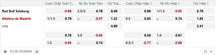 Bảng tỷ lệ kèo bóng đá RB Salzburg vs Atletico Madrid