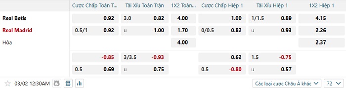 Bảng tỷ lệ kèo bóng đá Real Betis vs Real Madrid