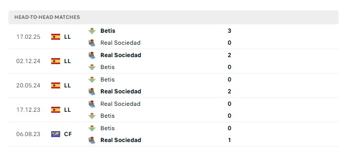 Lịch sử đối đầu Real Betis vs Real Sociedad