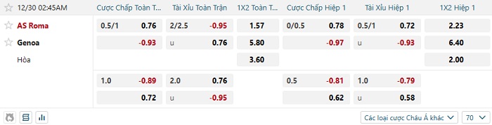 Soi kèo châu Á, kèo Roma vs Genoa
