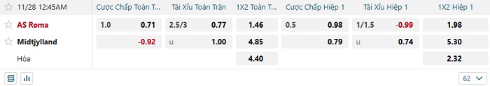 • Kèo tỷ số H1 Roma vs Midtjylland: 0-0