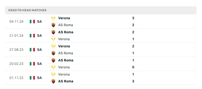 Lịch sử đối đầu Roma vs Verona