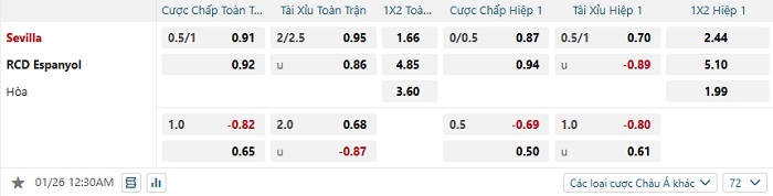 Bảng tỷ lệ kèo bóng đá Sevilla vs Espanyol