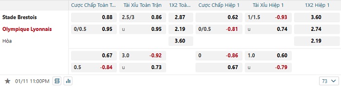 Bảng tỷ lệ kèo bóng đá Stade Brestois vs Lyon