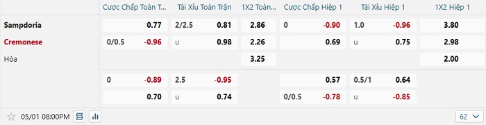 Tip kèo Châu Á full trận Sampdoria vs Cremonese