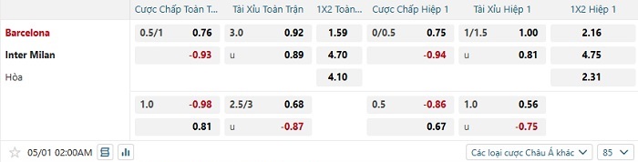 Tip kèo Châu Á hiệp 1 Barcelona vs Inter Milan