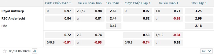Tip kèo Châu Á hiệp 1 Royal Antwerp vs Anderlecht