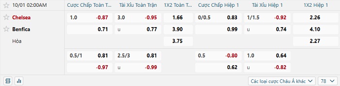 Tip kèo Châu Á full trận Chelsea vs Benfica