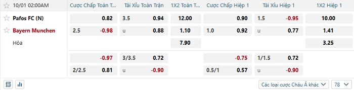 Tip kèo Châu Á full trận Pafos vs Bayern Munich