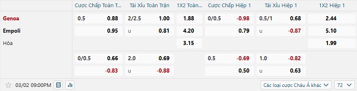 Tip kèo Châu Á full trận Genoa vs Empoli