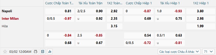 Tip kèo Châu Á hiệp 1 Napoli vs Inter Milan