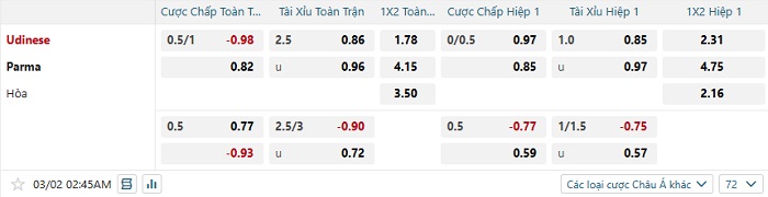 Tip kèo Châu Á hiệp 1 Udinese vs Parma