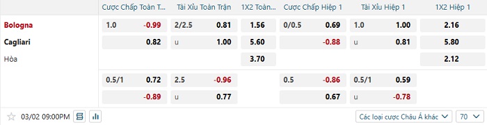 Tip kèo Châu Á full trận Bologna vs Cagliari