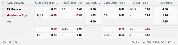 Tip kèo Châu Á full trận Monaco vs Man City