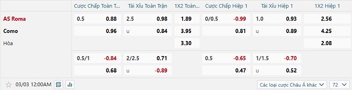 Tip kèo Châu Á full trận Roma vs Como