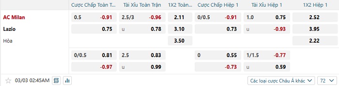 Tip kèo Châu Á full trận Milan vs Lazio