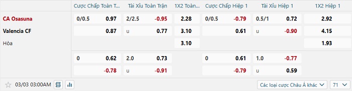 Tip kèo Châu Á full trận Osasuna vs Valencia