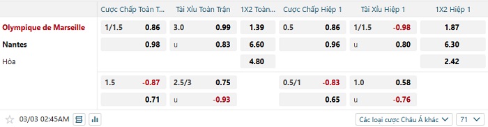 Tip kèo Châu Á hiệp 1 Marseille vs Nantes