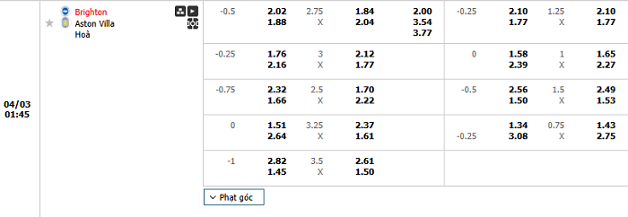 Tip kèo Châu Á full trận Brighton vs Aston Villa