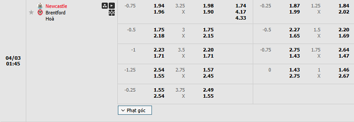 Tip kèo Châu Á full trận Newcastle vs Brentford