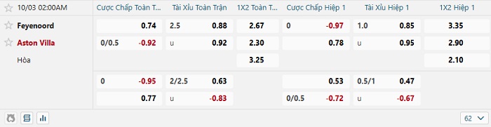 Tip kèo Châu Á hiệp 1 Feyenoord vs Aston Villa