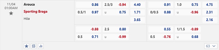 Tip kèo Châu Á hiệp 1 Arouca vs Braga